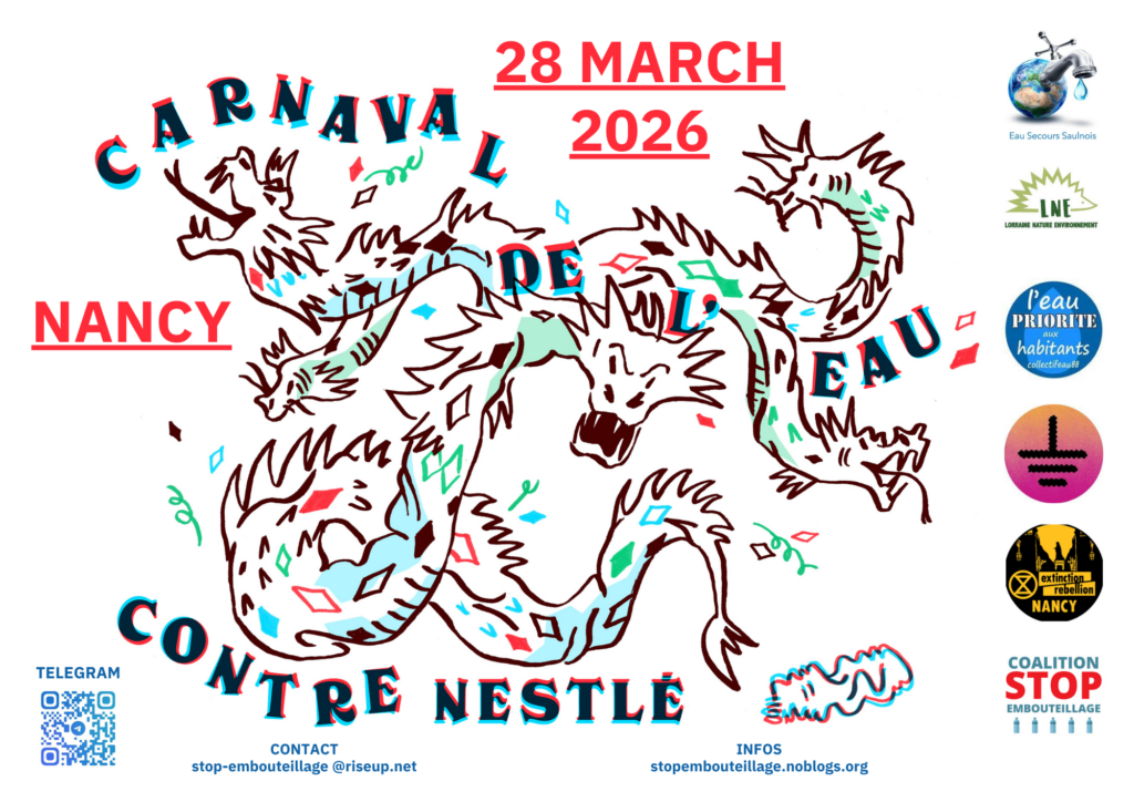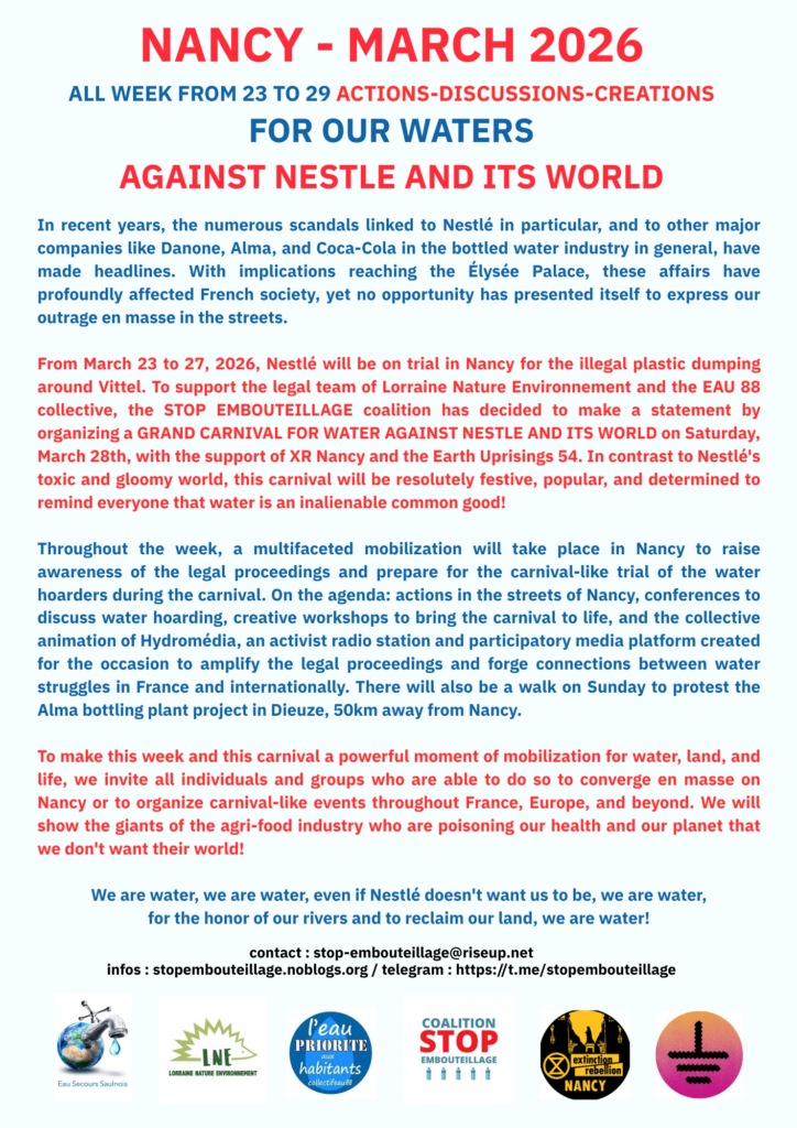 From March 23 to 27, 2026, Nestlé will be on trial in Nancy for the illegal plastic dumping around Vittel. To support the legal team of Lorraine Nature Environnement and the collectif EAU 88, the STOP BOTTLING coalition has decided to make a statement by organizing a GRAND CARNIVAL FOR WATER AGAINST NESTLE AND ITS WORLD on Saturday, March 28th, with the support of XR Nancy and Soulevements de la Terre 54. In contrast to Nestlé’s toxic and gloomy world, this carnival will be resolutely festive, popular, and determined to remind everyone that water is an inalienable common good!